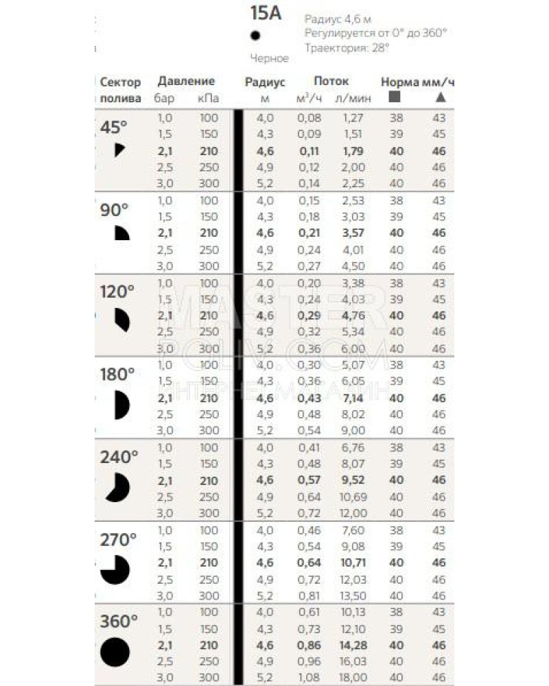 Сектор поливу налаштовується вручну без використання інструментів. При збільшенні кута зрошення витрата води також збільшується, що дозволяє точно налаштувати систему під потреби ділянки.