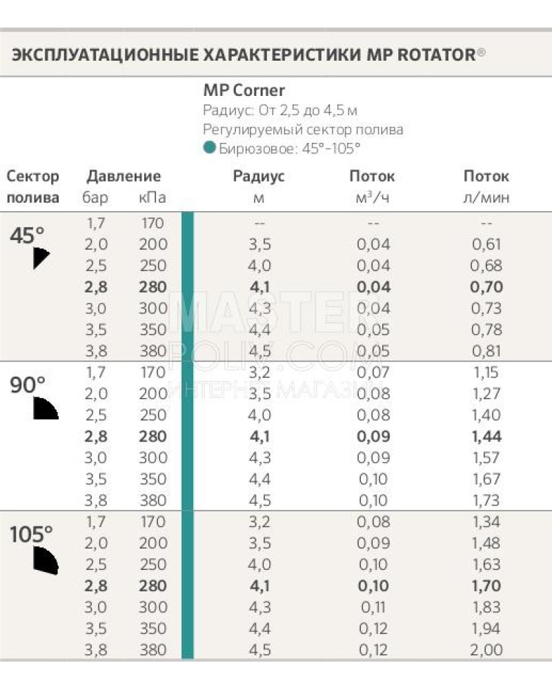 - Радіус поливу: 2,5 – 4,5 м