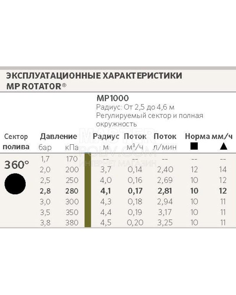 Форсунка забезпечує повний круг поливу (360°), що ідеально підходить для центрального розміщення на ділянці.